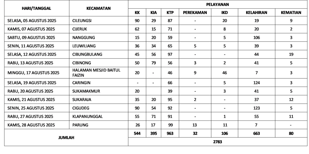Sebagai salah satu perwujudan Visi Misi daerah serta rangkaian Program Kunjungan Kerja Bupati/Wakil Bupati Bogor dalam Rangka Peringatan Hari Ulang Tahun (HUT) Kemerdekaan RI Ke-80 di Kabupaten Bogor, Maka Dinas Kependudukan dan Pencatatan Sipil turut berpartisipasi dalam rangka Gebyar Pelayanan Terpadu yang diselenggarakan di beberapa kecamatan.