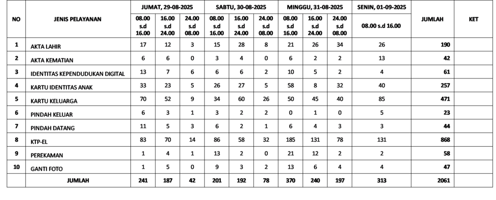 Hasilnya, sebanyak 2.061 layanan adminduk berhasil diselesaikan selama kegiatan berlangsung, seperti yang terlampir pada tabel berikut:
