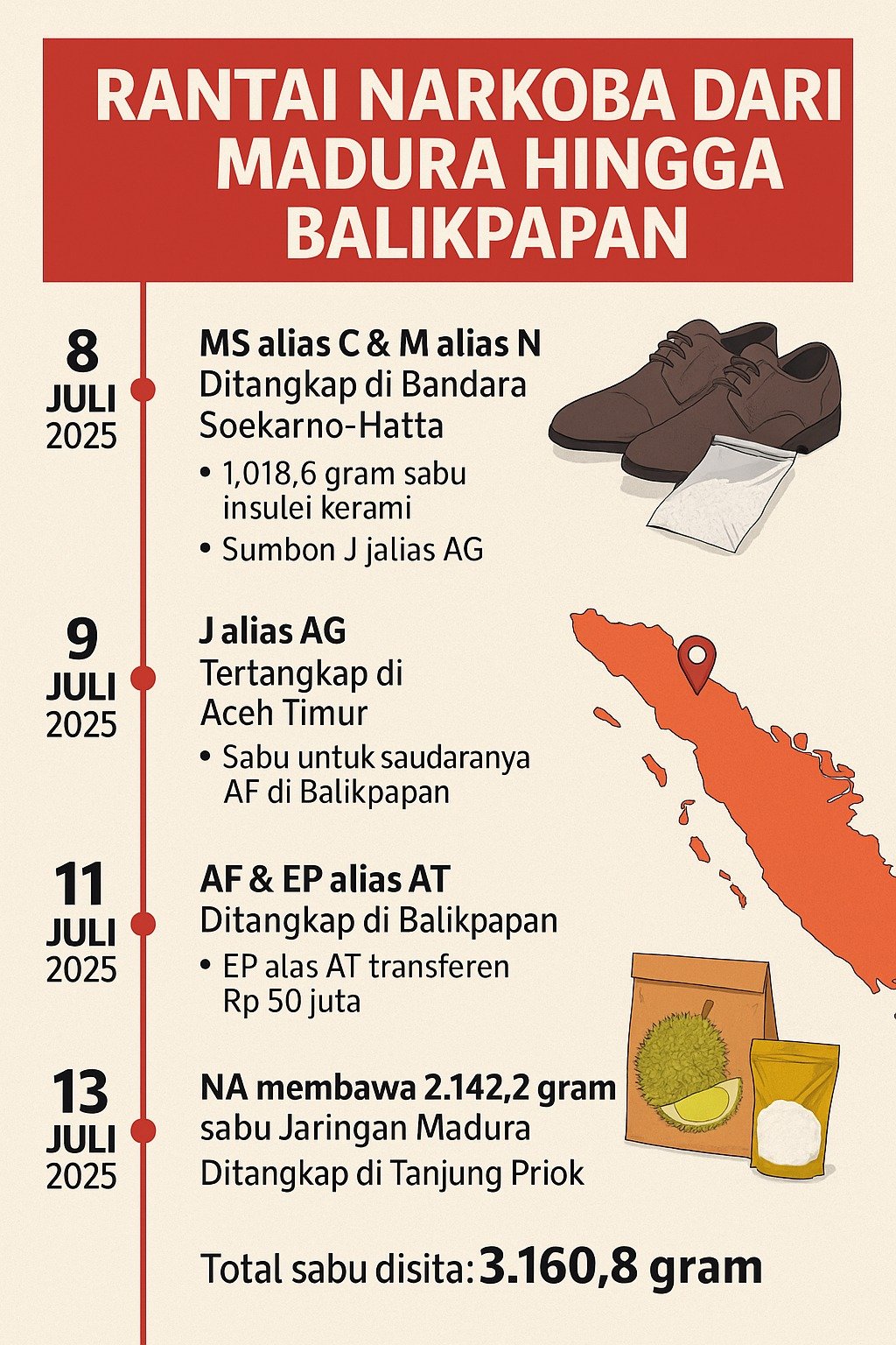 MonitorUpdate.com – Selama bulan Juli 2025, Badan Narkotika Nasional Provinsi (BNNP) DKI Jakarta mengungkap dua kasus besar peredaran sabu yang melibatkan jaringan antarprovinsi, dari Madura hingga Aceh. Total 3.160,8 gram sabu disita dari tujuh tersangka, termasuk seorang ibu dan anak, serta dua kurir yang menyelundupkan sabu dalam sol sepatu.